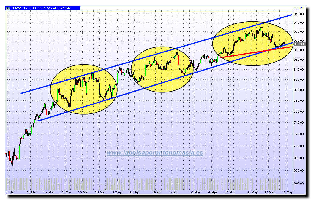 Y precisamente de eso se trata, de seguir creyendo en la tendencia alcista que aún no se ha visto seriamente afectada, pero estando en guardia ante la posibilidad de que esa formación se acabe confirmando (cruce a la baja de la línea roja) y con ello venga una corrección de mayor calado.