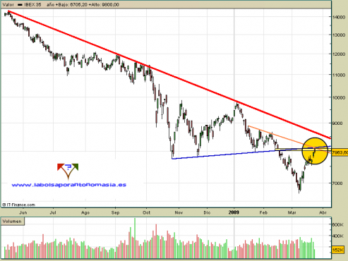 Esta mañana nuestro Ibex 35 se ha enfrentado por primera vez al cruce de resistencias que suponen la línea azul que marcamos en nuestro gráfico, soporte perdido y que ahora debería actuar como resistencia, el importantísimo nivel de resistencia horizontal en precios de cierre que cotiza en los 8.075 puntos y, por último, esa línea naranja de más corto plazo.