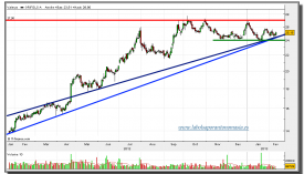 Cada vez que el precio se acerca a esas directrices alcistas que se marcan en la serie adjunta o a la zona de soporte horizontal (línea verde en la gráfica adjunta) que cotiza en los alrededores de los 24 euros, Grifols se anima y la cotización amaga la vuelta al alza.