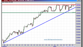 El gráfico del cfd sobre el Dow Jones Industrial que acompañamos es bastante expresivo: en el corto plazo, esa línea roja que redondeamos en los 14.000 puntos es la resistencia que viene impidiendo que la alegría compradora se desborde. Por abajo, la zona de los 13.850 puntos es el soporte que no deja que sea la tristeza vendedora la que se adueñe del sentimiento del mercado.