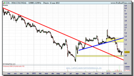 Nada bueno podía esperarse de un comportamiento tan irreverente hacia los soportes, y nada bueno aconteció. Ahora, la última frontera habita en otro soporte también nacido de un hueco alcista. Esa banda amarilla inferior que cotiza entre los 0,77 y los 0,8020 euros representó en su momento el comienzo del contundente rebote con el que hemos empezado esta narración. De momento ha servido como freno para las caídas y está aún por ver si será el resorte que cambie el rumbo de los precios.