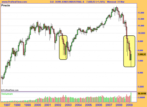 Atendiendo a los gráficos de más abajo, desde aquí entendemos que hay síntomas para entender que estamos ante el principio de un cambio de tendencia de bajista a alcista. El comportamiento del volumen en gráfico mensual y la incipiente tendencia alcista de corto plazo son nuestros argumentos. Evidentemente, aún quedan muchas resistencias que batir en el difícil camino que haga escalar a los mercados hacia la tendencia primaria.