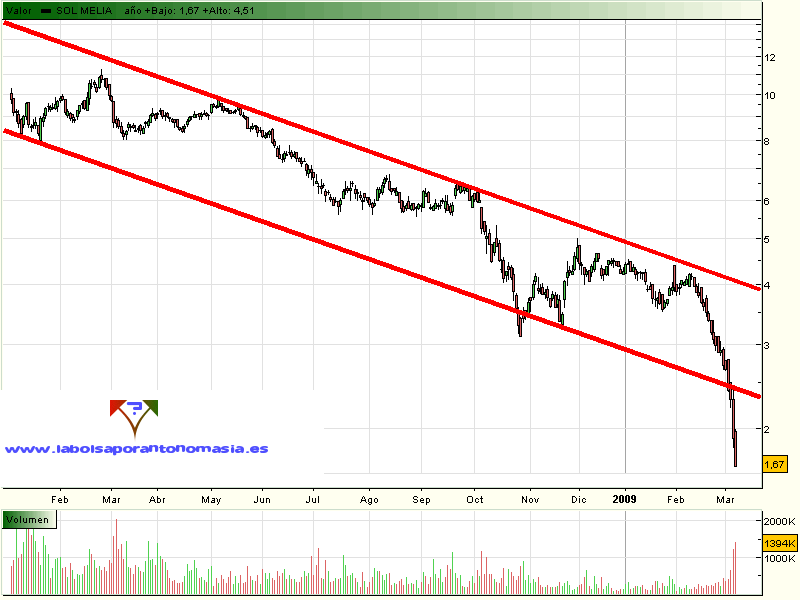 Me habréis oído decir muchas veces que todo es susceptible de seguir bajando mientras cotice por encima de cero. Pero, ¿qué se puede decir cuando la proyección que la base de un canal bajista da para el precio cotiza por debajo de cero?