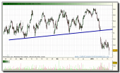 Iniciamos este repaso con Banco Popular, gráfico que muestra una lógica corrección tras esa explosión alcista que llevó al precio sin solución de continuidad a subir casi un euro. La zona de los 5,60-5,55 euros, lugar donde colocamos esa línea azul, es, sin duda, el nivel en el que siempre hemos pensado como posible zona de parada y fonda antes de reiniciar las subidas. Incluso un poco más abajo, por los 5,50 euros, todo entraría dentro de la normalidad que impone el hecho de que nunca se suba eternamente en vertical. De perderse los niveles indicados, la línea verde en la zona de los 5,30 euros pasaría a ser la referencia por abajo. Por arriba, convendría ver la rotura de esas líneas de resistencia y de la cadena de máximos y mínimos decrecientes impuesta por la corrección.