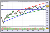 Así que, un poco por variar y un poco porque nos gusta saber su opinión, nos decidimos a echar un vistazo a nuestro buen amigo Dow Jones Transportes. Y lo pimero y más importante que notamos es que la cotización se encuentra justo en esa zona (línea naranja de la serie) de resistencia horizontal que ya ha parado recientemente otras dos veces al índice.